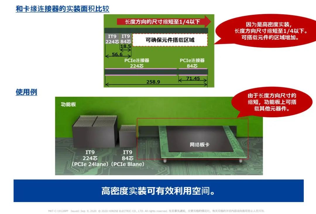 1 支持高速传输(28 + Gbps) 2 高密度: 50差分对/inch(224芯) 3 浮动构造: 可以在同一基板上实装多个连接器 4 选型 芯数:84芯、152芯、224芯 对应PCI Express 4.0/5.0